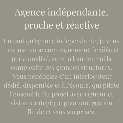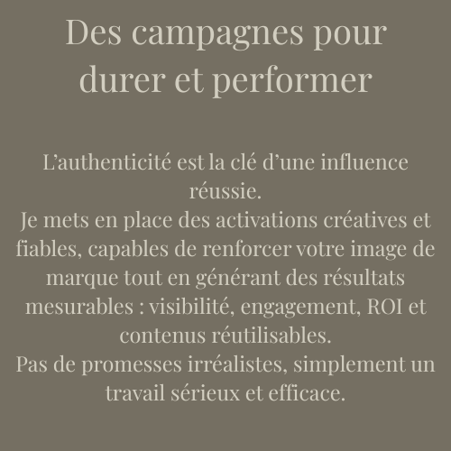 Je donne vie à vos idées en créant une stratégie digitale qui vous ressemble, authentique et alignée avec vos valeurs. Je m’occupe de la gestion et du développement de vos réseaux sociaux, tout en imaginant des campagnes d’influence et de contenus générés par vos utilisateurs, pour renforcer votre présence de manière sincère et impactante.